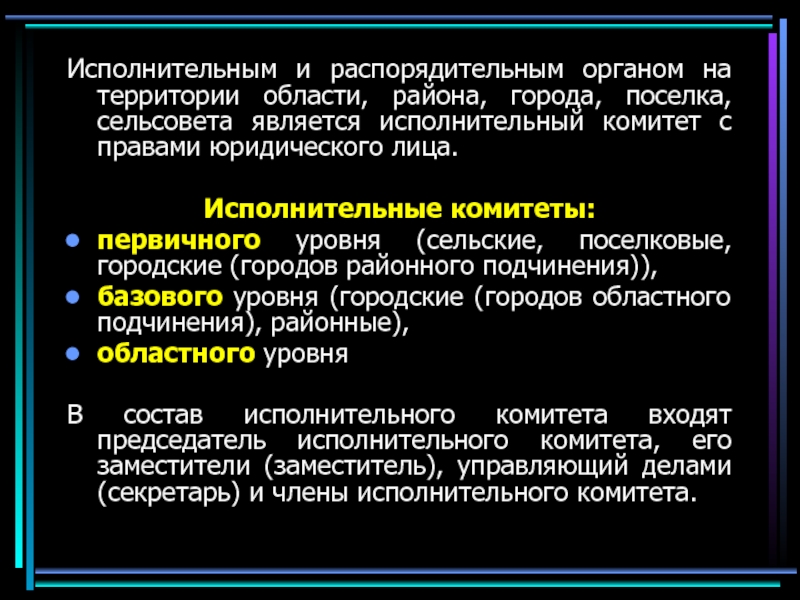Слайд 22Исполнительным и распорядительным органом на территории области, района, города, поселка,