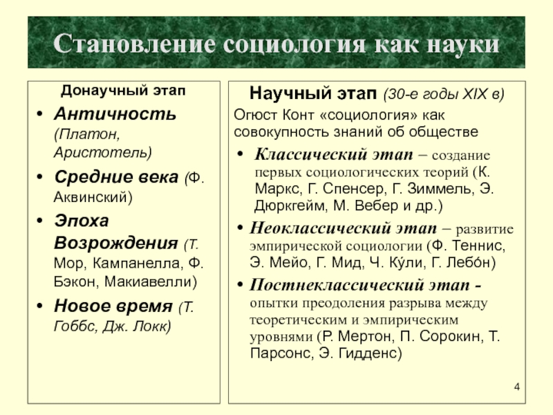Классический этап – создание первых социологических теорий (К.Маркс, Г. Спенсер, Г. Зиммель, Э. Дюркгейм, М. Вебер и др.)