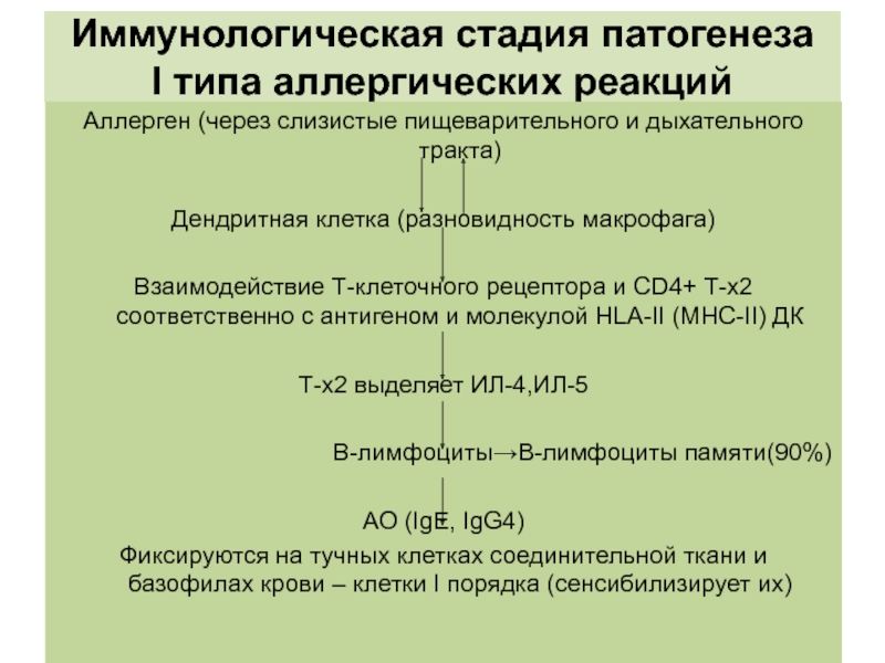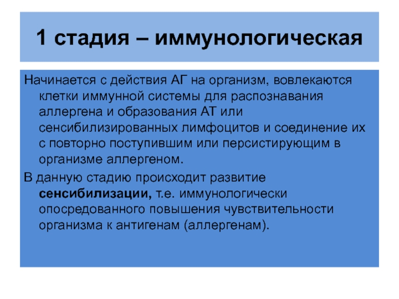 В данную стадию происходит развитие сенсибилизации, т.е. иммунологически опосредованного повышения чувствительности организма к антигенам (аллергенам).
