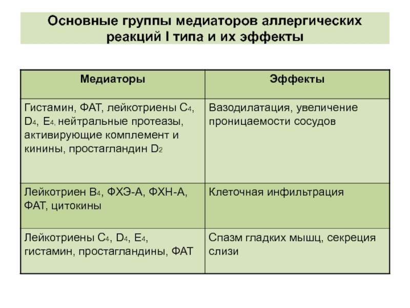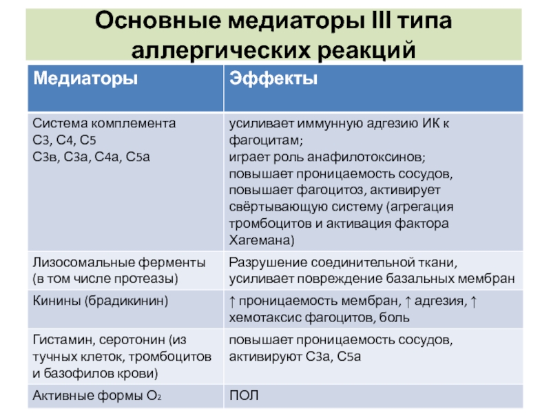 Слайд 34Основные медиаторы ΙΙΙ типа аллергических реакций