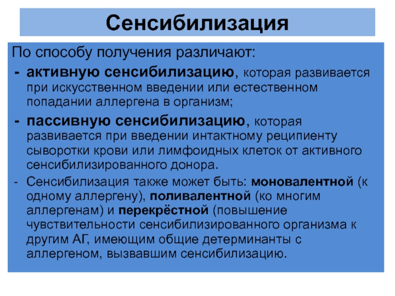 Сенсибилизация также может быть: моновалентной (к одному аллергену), поливалентной (ко многим аллергенам) и перекрёстной (повышение чувствительности сенсибилизированного организма к другим АГ, имеющим общие детерминанты с аллергеном, вызвавшим сенсибилизацию.