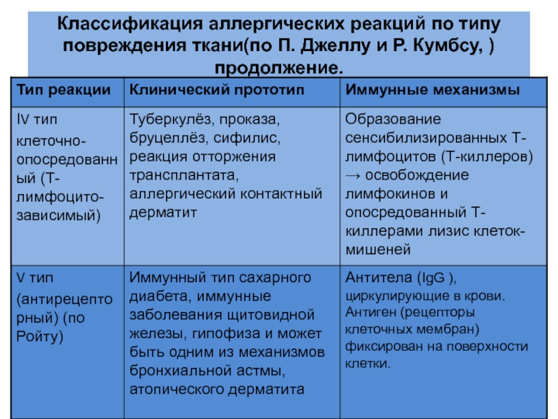 Слайд 9Классификация аллергических реакций по типу повреждения ткани(по П. Джеллу и