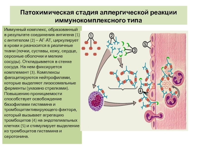 крови и разносится в различные ткани (почки, суставы, кожу, сердце, серозные оболочки и мелкие сосуды). Откладывается в стенке сосуда. На нем фиксируется комплемент (3). Комплексы фагоцитируются нейтрофилами, которые выделяют лизосомальные ферменты (указано стрелками). Повышению проницаемости способствует освобождение базофилами гистамина и тромбоцитактивирующего фактора, который вызывает агрегацию тромбоцитов (4) на эндотелиальных клетках (5) и стимулирует выделение из тромбоцитов гистамина и серотонина.