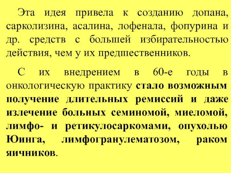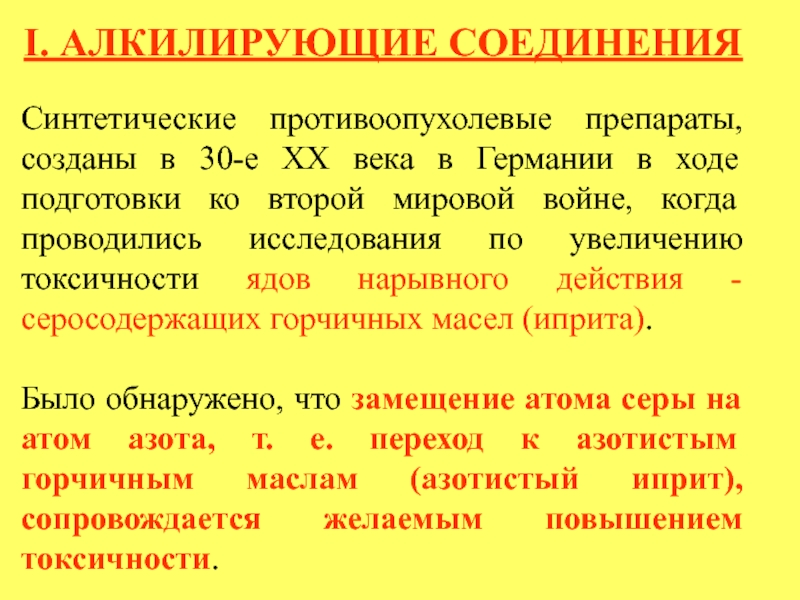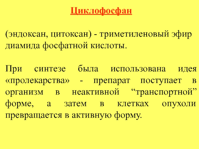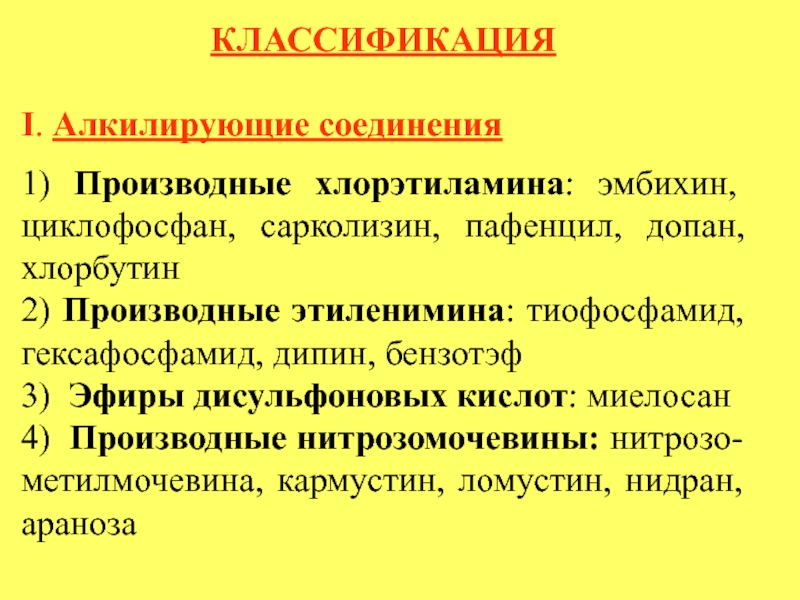 1) Производные хлорэтиламина: эмбихин, циклофосфан, сарколизин, пафенцил, допан,