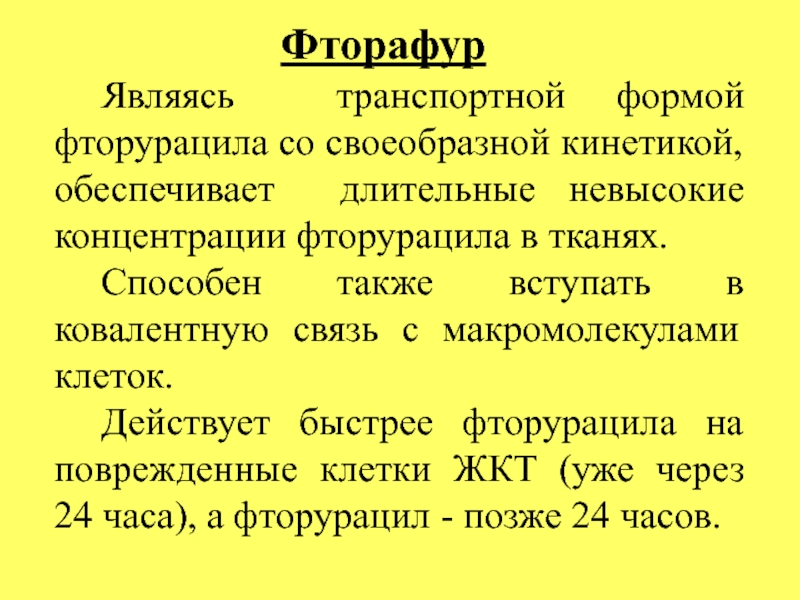 Действует быстрее фторурацила на поврежденные клетки ЖКТ (уже через 24 часа), а фторурацил - позже 24 часов.