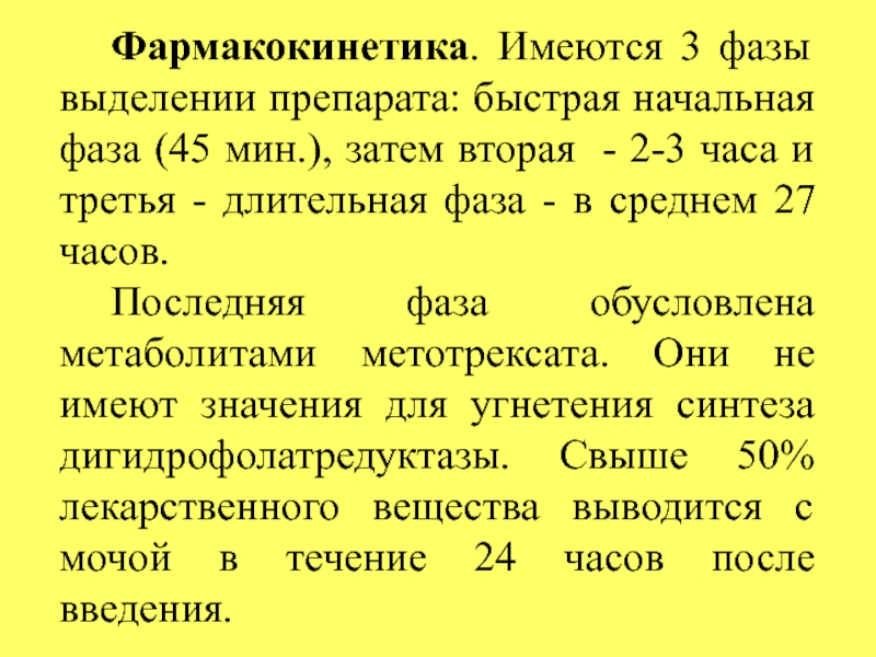 Последняя фаза обусловлена метаболитами метотрексата. Они не имеют значения для угнетения синтеза дигидрофолатредуктазы. Свыше 50% лекарственного вещества выводится с мочой в течение 24 часов после введения.