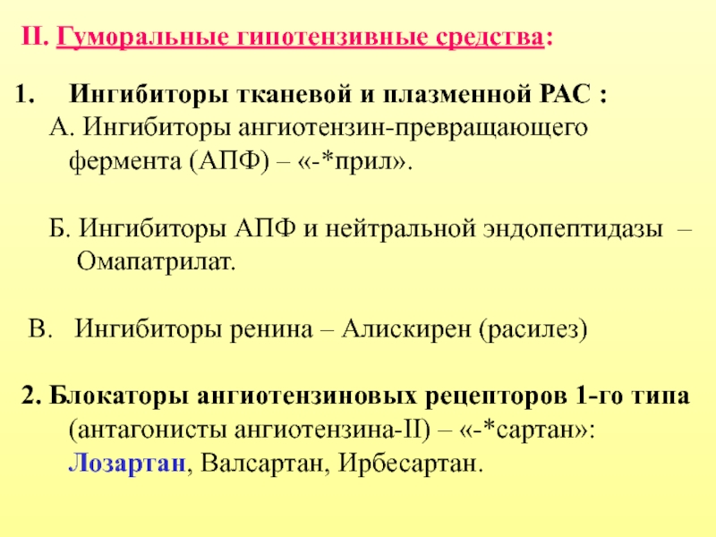 2. Блокаторы ангиотензиновых рецепторов 1-го типа (антагонисты ангиотензина-II) – «-*сартан»: Лозартан, Валсартан, Ирбесартан.