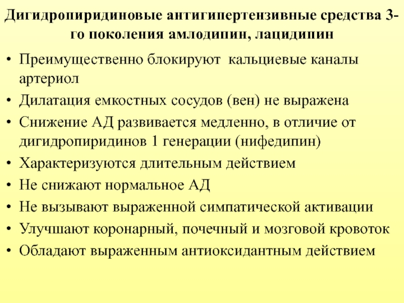 Слайд 57Дигидропиридиновые антигипертензивные средства 3-го поколения амлодипин, лацидипин