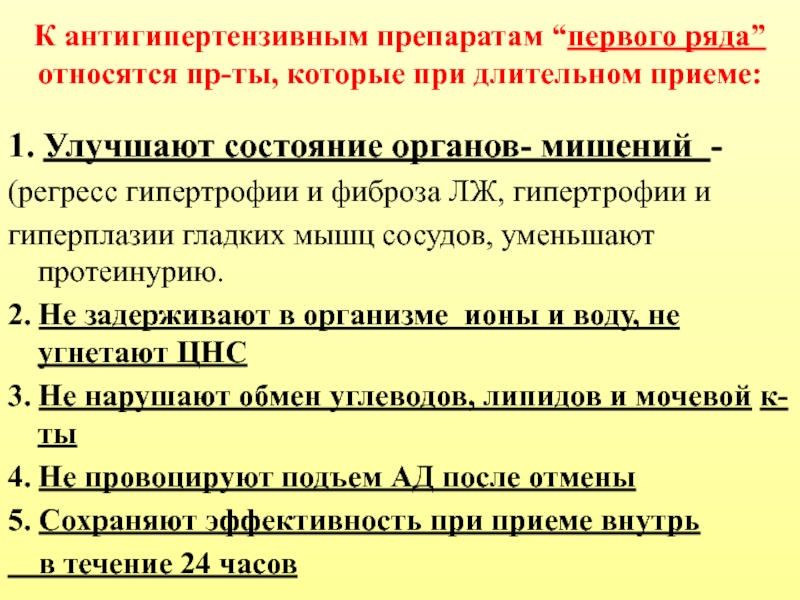 Слайд 16К антигипертензивным препаратам “первого ряда”относятся пр-ты, которые при длительном приеме: