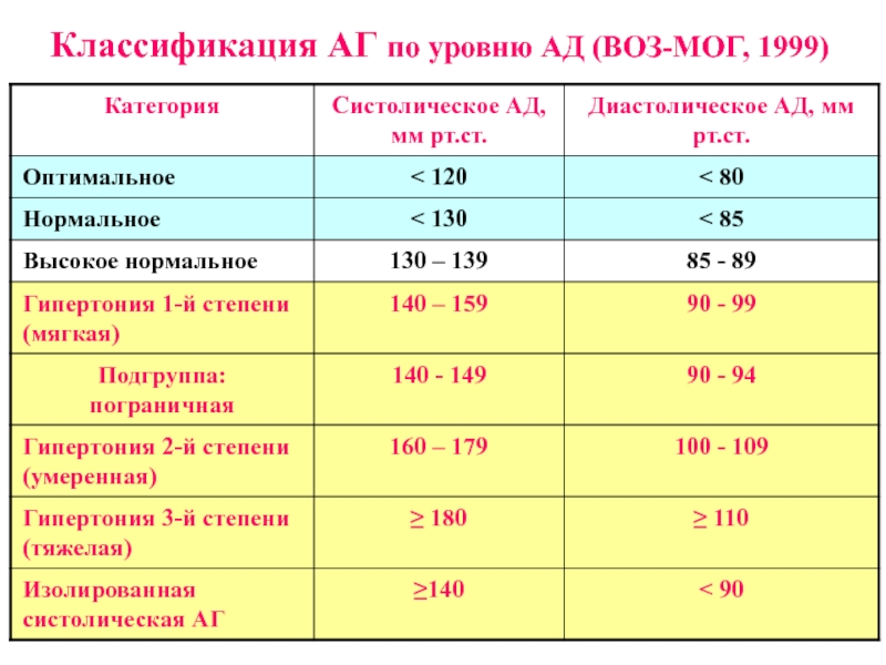 Слайд 4Классификация АГ по уровню АД (ВОЗ-МОГ, 1999)