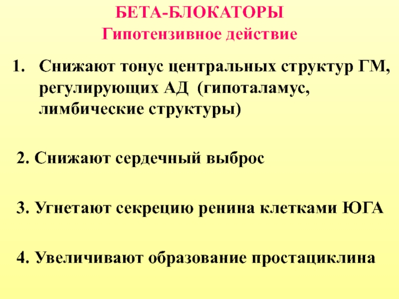 Снижают тонус центральных структур ГМ, регулирующих АД (гипоталамус,