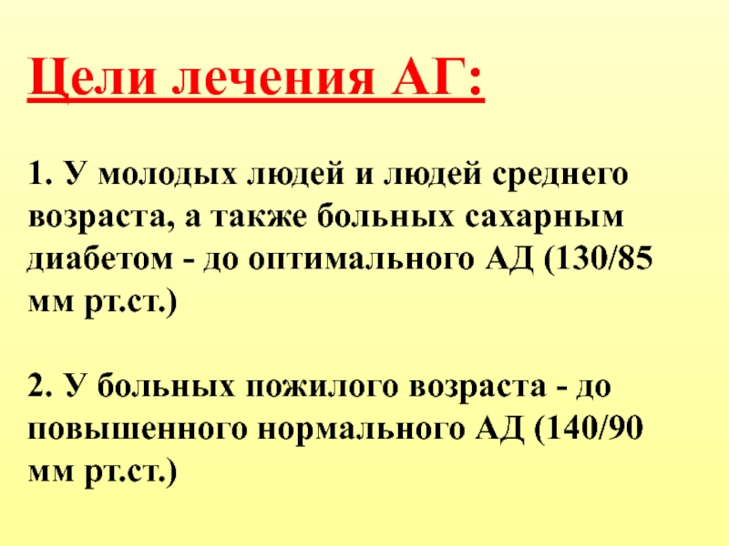 2. У больных пожилого возраста - до повышенного нормального АД (140/90 мм рт.ст.)