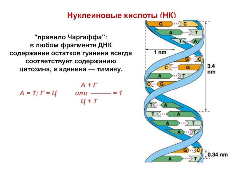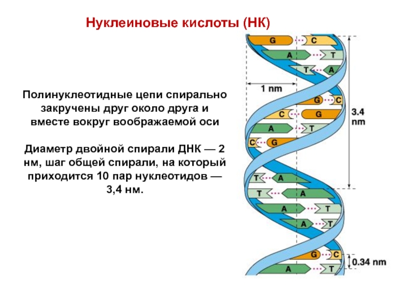 шаг общей спирали, на который приходится 10 пар нуклеотидов — 3,4 нм.