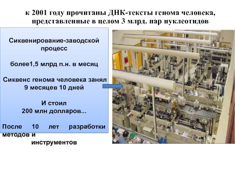 к 2001 году прочитаны ДНК-тексты генома человека, представленные в целом 3 млрд. пар нуклеотидов