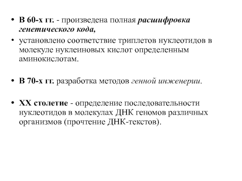 Слайд 6В 60-х гг. - произведена полная расшифровка генетического кода,