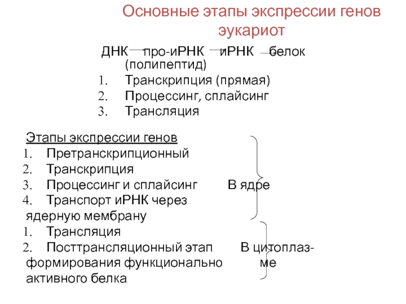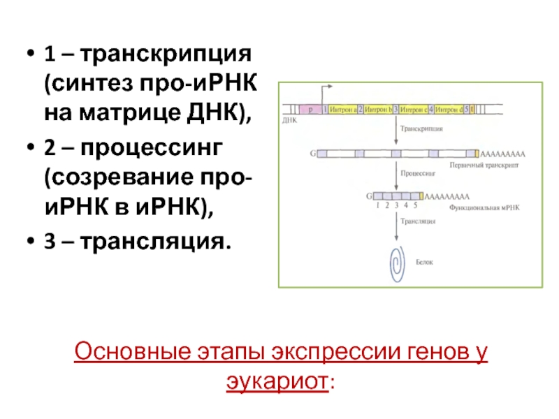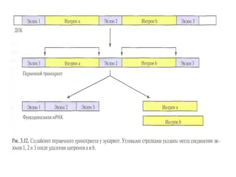 3) Процессинг – сплайсинг – «вырезание» интронов и «сшивание» (ферментами-рибозимами) экзонов.