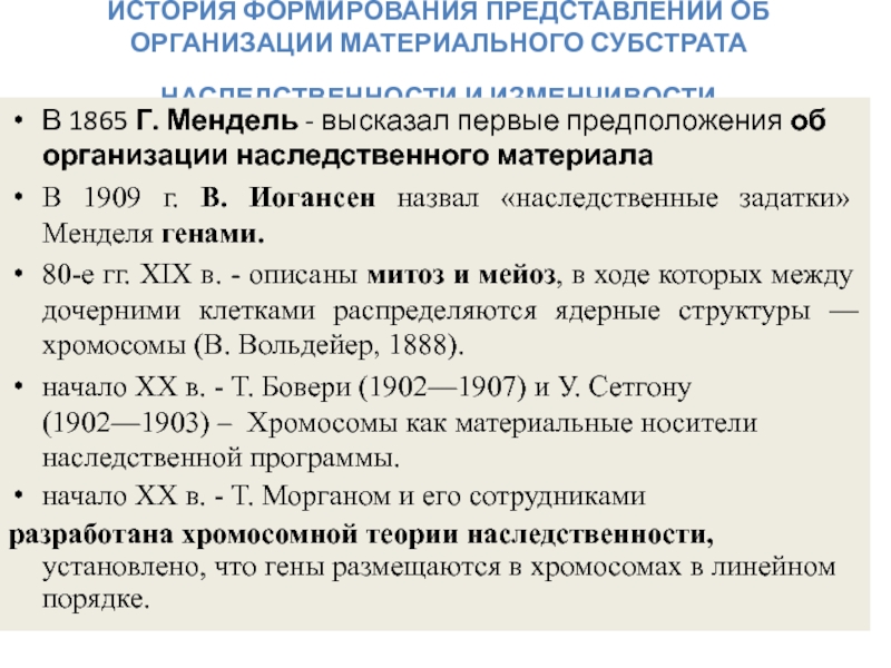 Слайд 4ИСТОРИЯ ФОРМИРОВАНИЯ ПРЕДСТАВЛЕНИЙ ОБ ОРГАНИЗАЦИИ МАТЕРИАЛЬНОГО СУБСТРАТА НАСЛЕДСТВЕННОСТИ И ИЗМЕНЧИВОСТИ