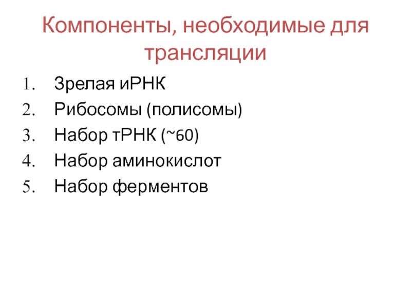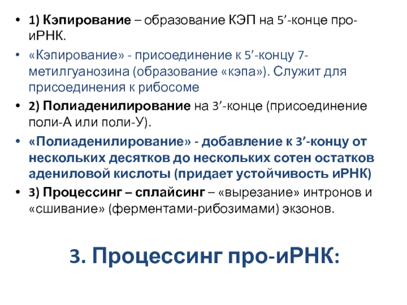 «Полиаденилирование» - добавление к 3’-концу от нескольких десятков до нескольких сотен остатков адениловой кислоты (придает устойчивость иРНК)