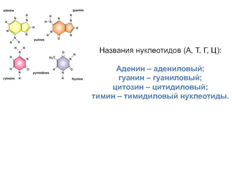 Слайд 15Названия нуклеотидов (А, Т, Г, Ц):