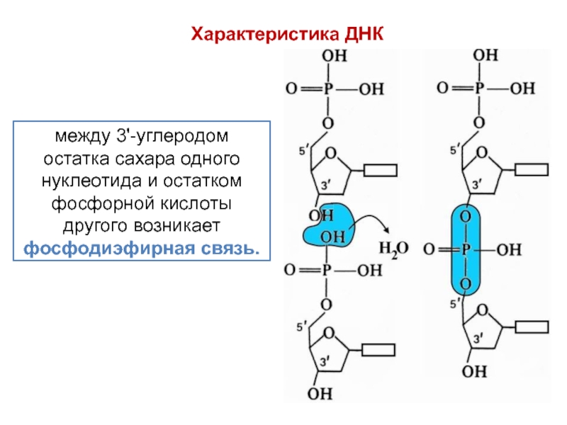 Слайд 16между 3'-углеродом остатка сахара одного нуклеотида и остатком фосфорной кислоты