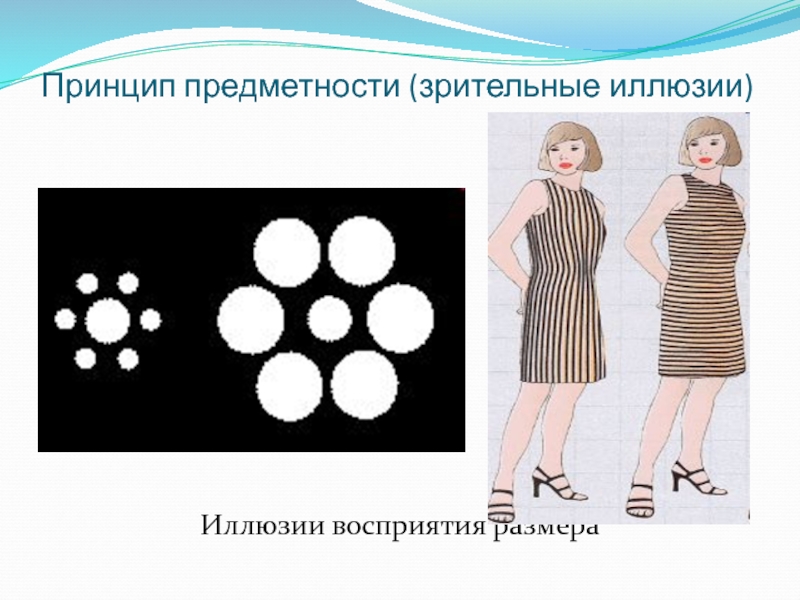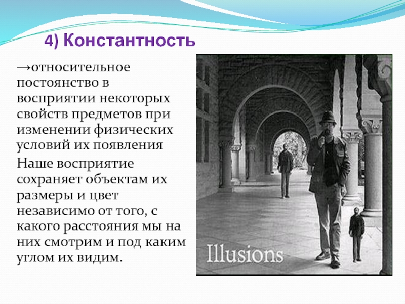В. Если воспринимаемый на некотором расстоянии предмет удалить от воспринимающего, то отображение предмета на сетчатке уменьшится как в длину, так и в ширину, т.е. уменьшится его площадь, а между тем в восприятии образ сохраняет в определённых пределах приблизительно ту же постоянную, свойственную предмету величину.