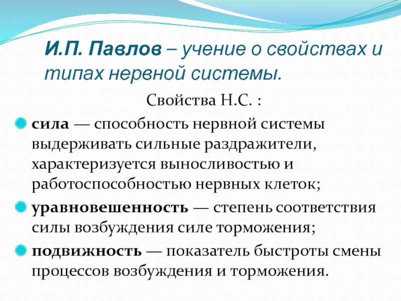 Слайд 82И.П. Павлов – учение о свойствах и типах нервной системы.