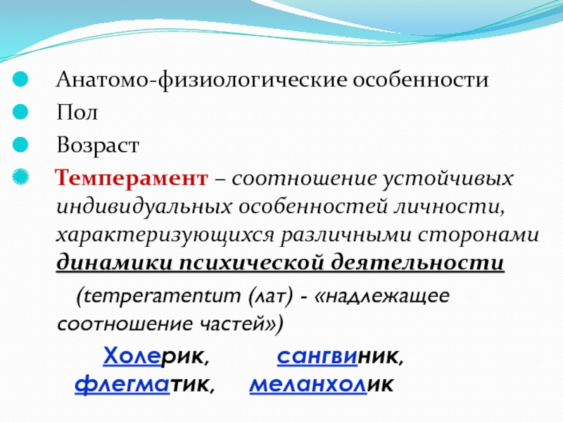 Темперамент – соотношение устойчивых индивидуальных особенностей личности, характеризующихся различными