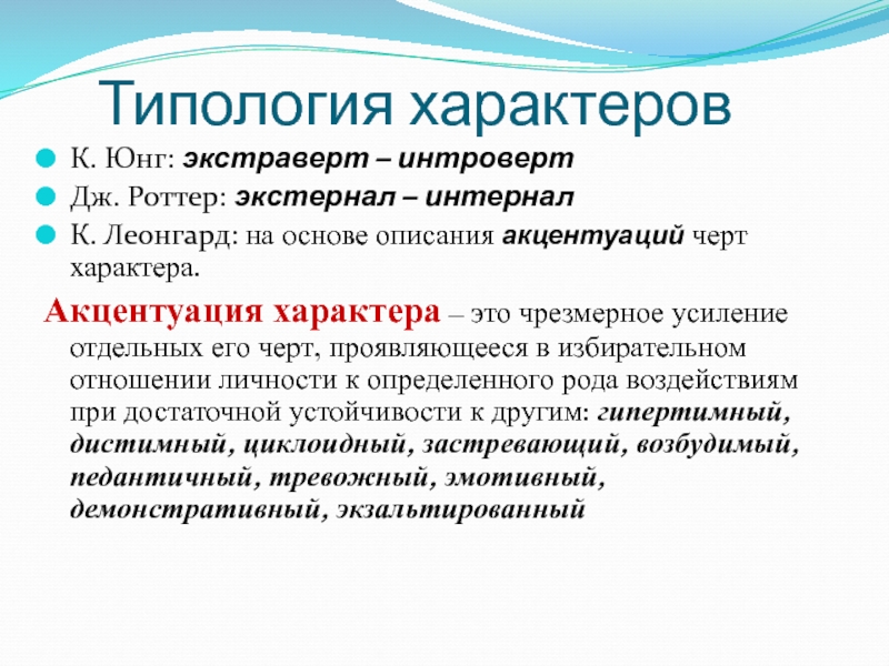 чрезмерное усиление отдельных его черт, проявляющееся в избирательном отношении личности к определенного рода воздействиям при достаточной устойчивости к другим: гипертимный, дистимный, циклоидный, застревающий, возбудимый, педантичный, тревожный, эмотивный, демонстративный, экзальтированный
