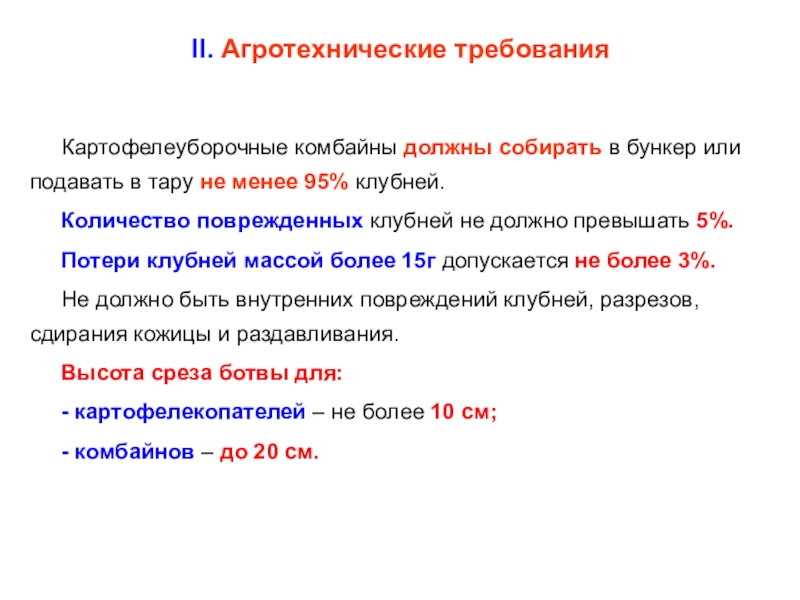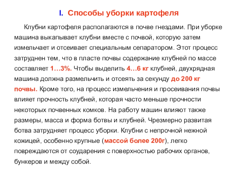 Для успешного применения машинной уборки картофеля необходимо добиваться, чтобы растения образовывали компактные гнезда, нераскидистый куст ботвы, имели выровненные клубни округлой формы с прочной кожицей и мякотью, массой 80…200г, легко отделяющиеся от столонов.