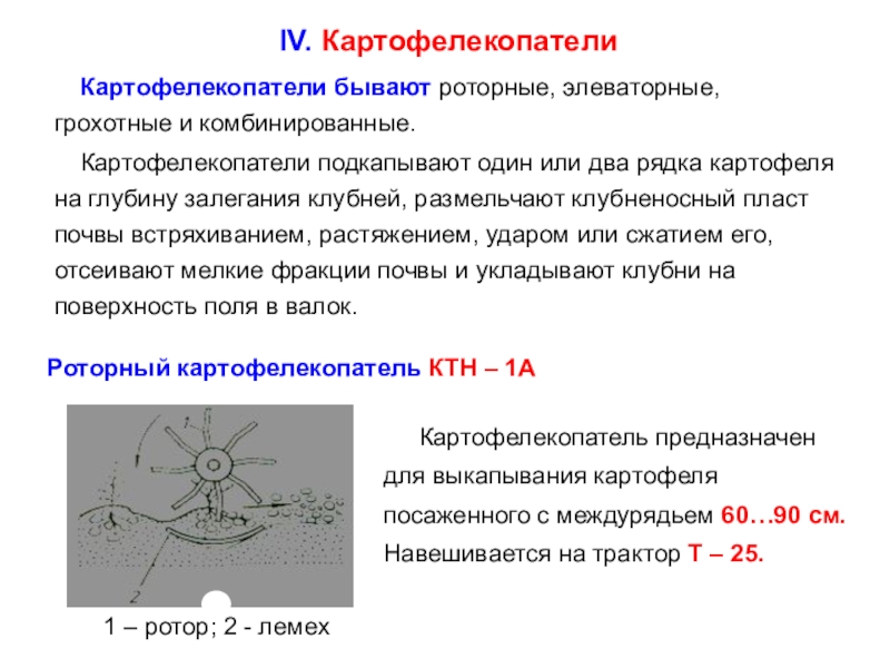 Картофелекопатель предназначен для выкапывания картофеля посаженного с междурядьем 60…90 см. Навешивается на трактор Т – 25.