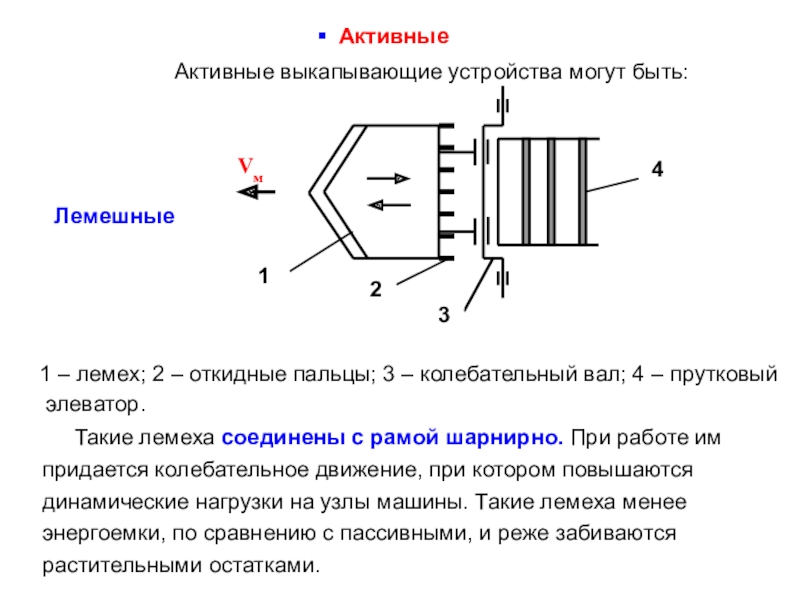 1 – лемех; 2 – откидные пальцы; 3 – колебательный вал; 4 – прутковый