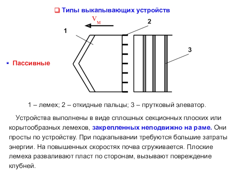 1 – лемех; 2 – откидные пальцы; 3 – прутковый элеватор.