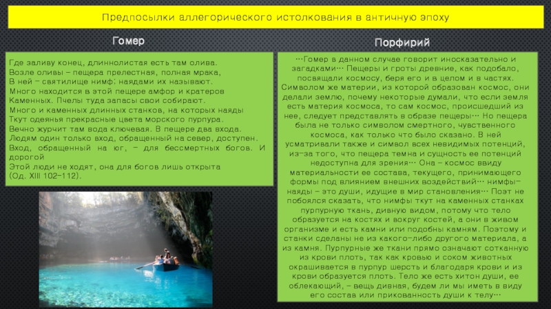 …Гомер в данном случае говорит иносказательно и загадками… Пещеры и гроты древние, как подобало, посвящали космосу, беря его и в целом и в частях. Символом же материи, из которой образован космос, они делали землю, почему некоторые думали, что если земля есть материя космоса, то сам космос, происшедший из нее, следует представлять в образе пещеры… Но пещера была не только символом смертного, чувственного космоса, как только что было сказано. В ней усматривали также и символ всех невидимых потенций, из-за того, что пещера темна и сущность ее потенций недоступна для зрения… Она – космос ввиду материальности ее состава, текущего, принимающего формы под влиянием внешних воздействий… нимфы-наяды – это души, идущие в мир становления… Поэт не побоялся сказать, что нимфы ткут на каменных станках пурпурную ткань, дивную видом, потому что тело образуется на костях и вокруг костей, а они в живом организме и есть камни или подобны камням. Поэтому и станки сделаны не из какого-либо другого материала, а из камня. Пурпурные же ткани прямо означают сотканную из крови плоть, так как кровью и соком животных окрашивается в пурпур шерсть и благодаря крови и из крови образуется плоть. Тело же есть хитон души, ее облекающий, – вещь дивная, будем ли мы иметь в виду его состав или прикованность души к телу…