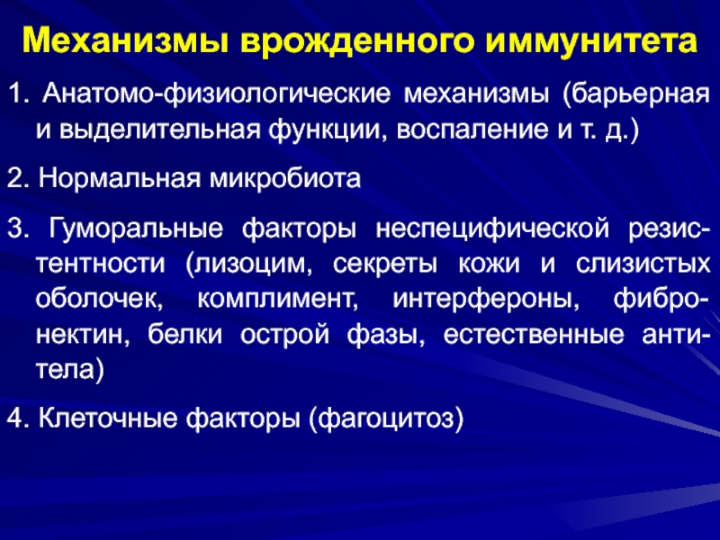 секреты кожи и слизистых оболочек, комплимент, интерфероны, фибро-нектин, белки острой фазы, естественные анти-тела)