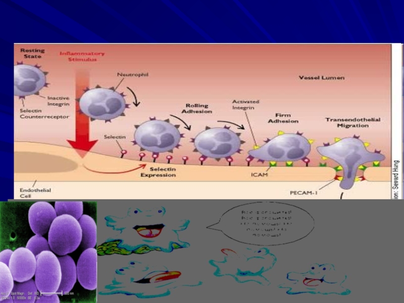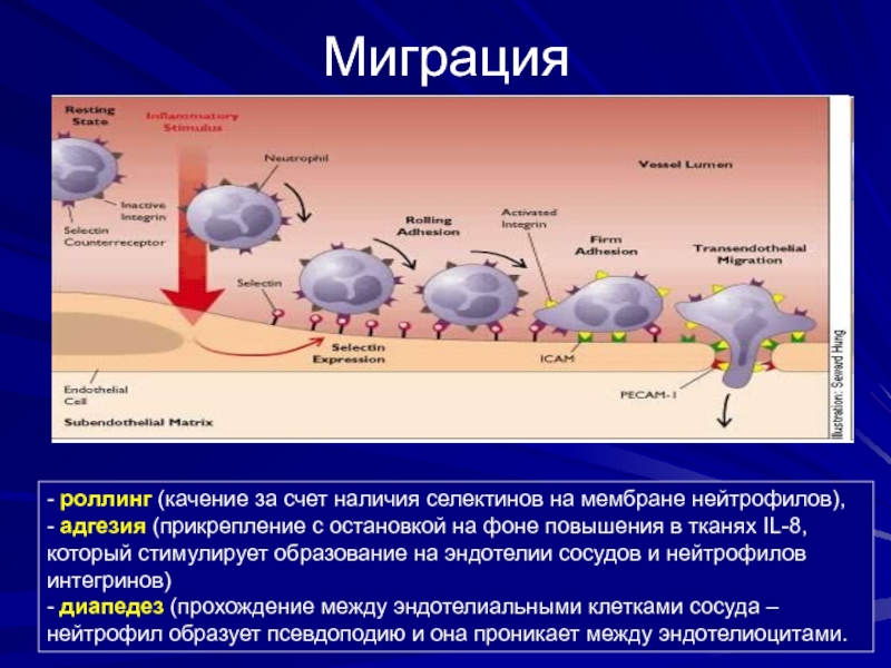 - роллинг (качение за счет наличия селектинов на мембране нейтрофилов),