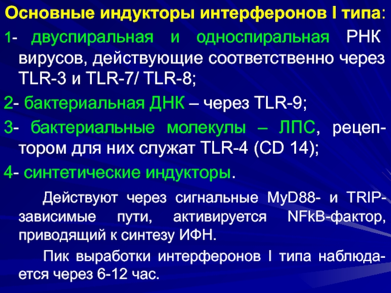 Действуют через сигнальные МуD88- и TRIP-зависимые пути, активируется NFkB-фактор, приводящий к синтезу ИФН.