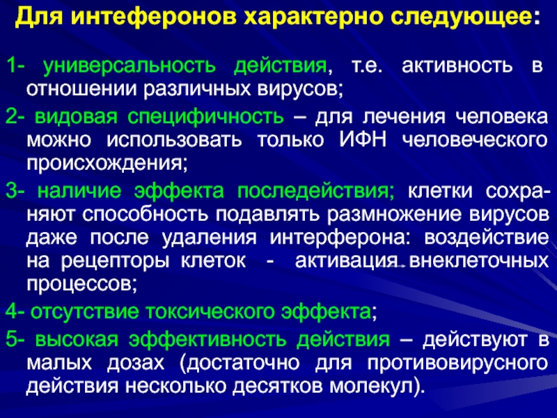 5- высокая эффективность действия – действуют в малых дозах (достаточно для противовирусного действия несколько десятков молекул).