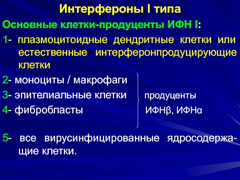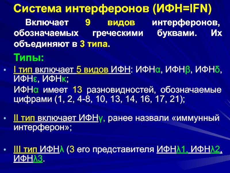 II тип включает ИФНγ, ранее назвали «иммунный интерферон»;