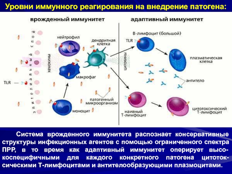 в то время как адаптивный иммунитет оперирует высо-коспецифичными для каждого конкретного патогена цитоток-сическими Т-лимфоцитами и антителообразующими плазмоцитами.