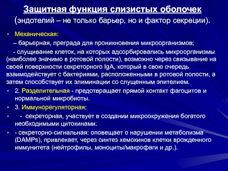 Слайд 11Защитная функция слизистых оболочек (эндотелий – не только барьер, но
