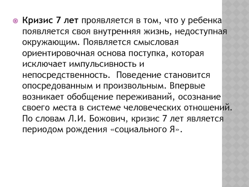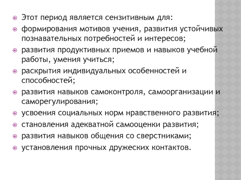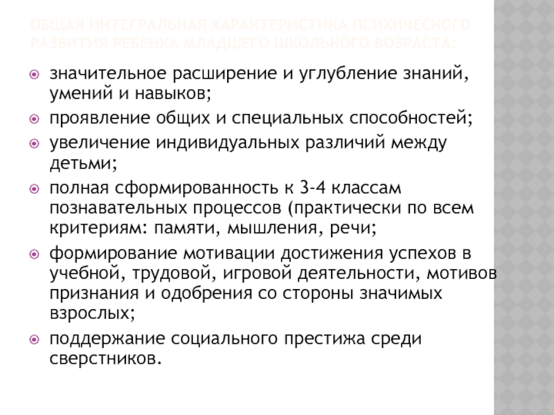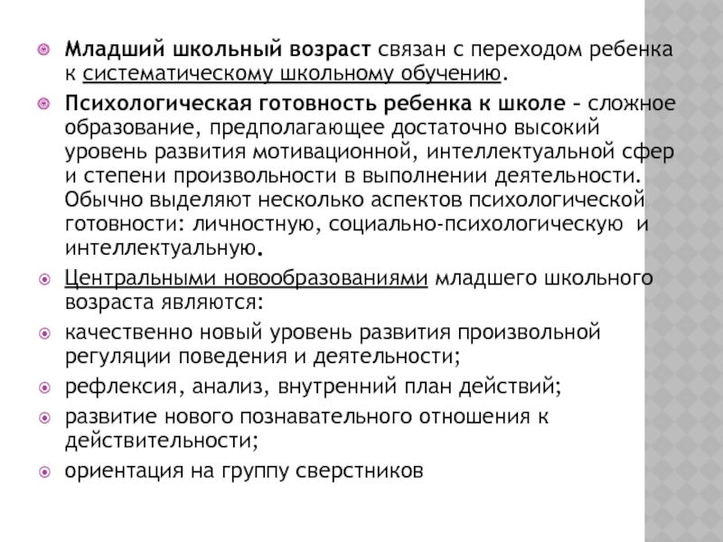 Личностные новообразования возраста: возникновение внутреннего плана действий, закрепление произвольности, устойчивых форм поведения и деятельности; формирование позиции школьника; развитие общественной направленности; развитие познавательного отношения к действительности; складывание характера.