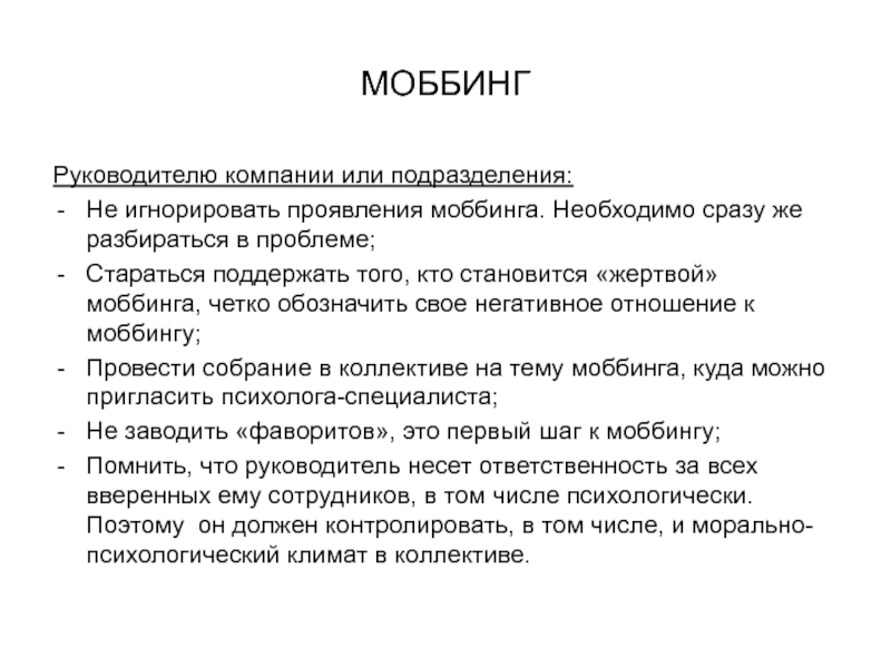 Не игнорировать проявления моббинга. Необходимо сразу же