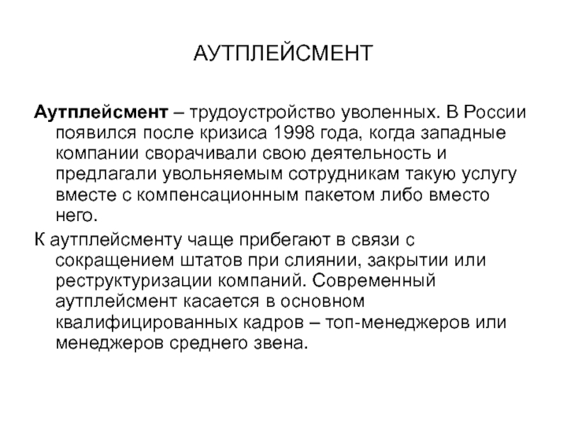 Аутплейсмент – трудоустройство уволенных. В России появился после кризиса 1998