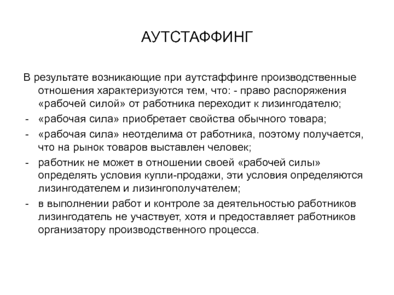 принципиальные изменения: лизингодатель приобретает на рынке труда у работника его «рабочую силу» не для использования в собственном производственном процессе, а для ее перепродажи, но уже не на рынке труда, а на рынке товаров (работ, услуг) организатору производства.