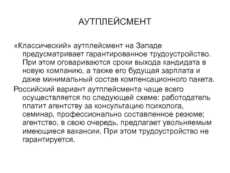 «Классический» аутплейсмент на Западе предусматривает гарантированное трудоустройство. При этом оговариваются