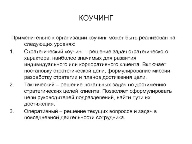 Применительно к организации коучинг может быть реализован на следующих уровнях: