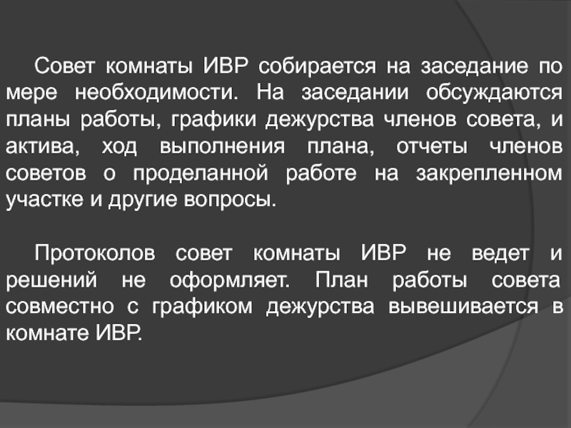 Протоколов совет комнаты ИВР не ведет и решений не оформляет. План работы совета совместно с графиком дежурства вывешивается в комнате ИВР.