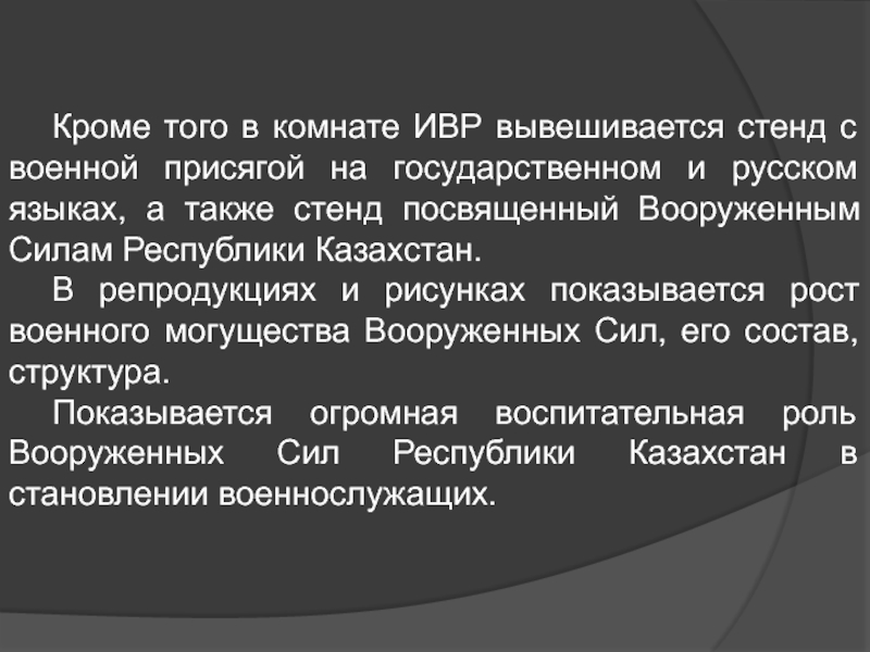 Слайд 19 Кроме того в комнате ИВР вывешивается стенд с военной присягой