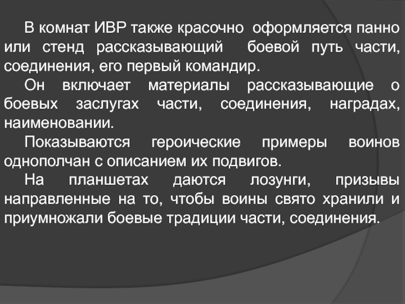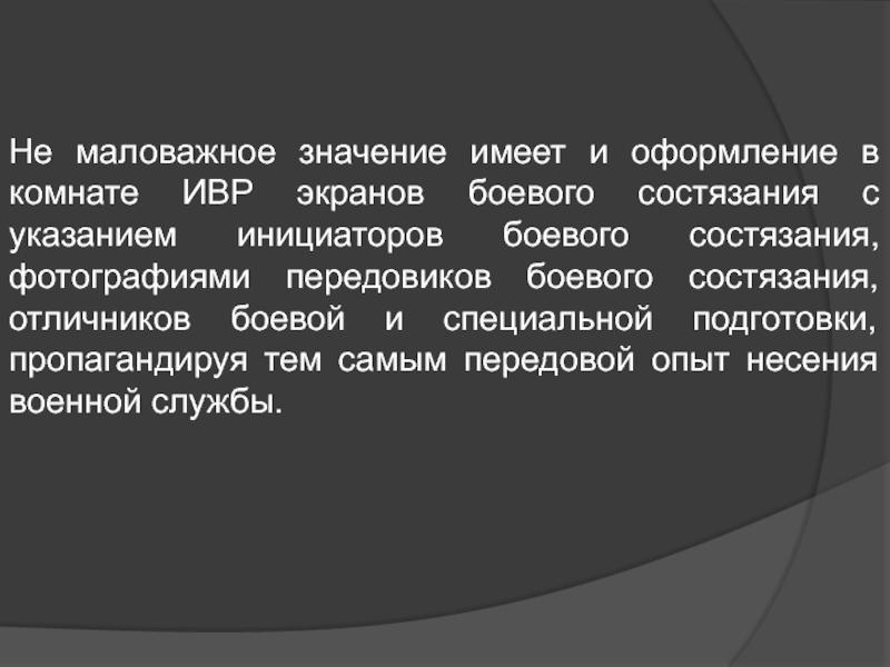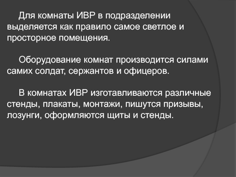 Комнаты ИВР должны быть местом массовой и культурно-досуговой работы с личным составом подразделения, самым массовым очагом армейской культуры.