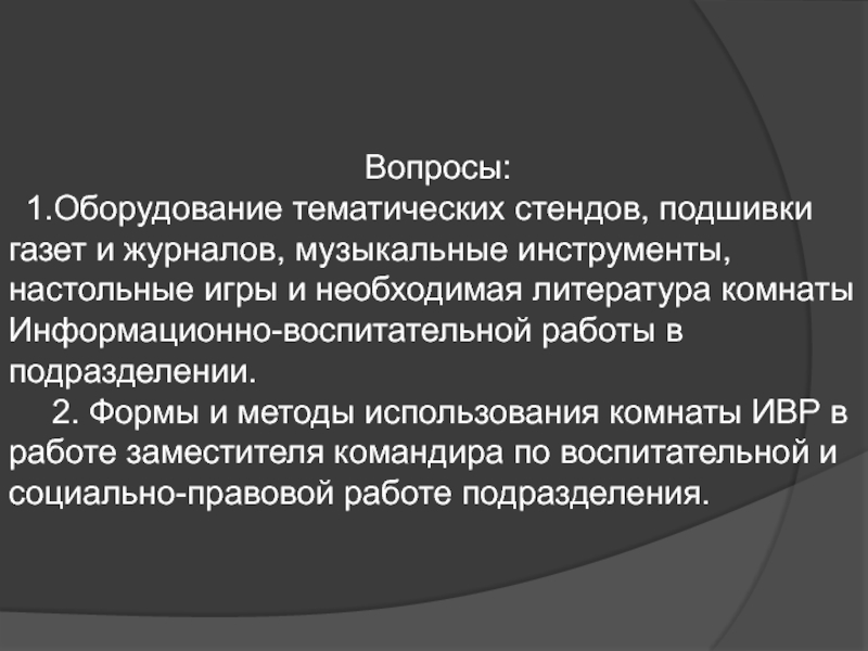 Слайд 3 В организации культурно-досуговой работы в подразделении большое значение имеют комнаты